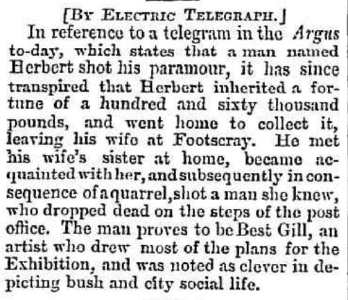 [BY ELECTRIC TELEGRAPH.] In reference to a telegram in the Argus to-day, which states that a man named Herbert shot his paramour, it has since transpired that Herbert inherited a fortune of a hundred and sixty thousand pounds, and went home to collect it, leaving his wife at Footscray. He met his wife's sister at home, became acquainted with her, and subsequently in consequence of a quarrel, shot a man she knew, who dropped dead on the steps of the post office. The man proves to be Best Gill, an artist who drew most of the plans for the Exhibition, and was noted as clever in depicting bush and city social life.